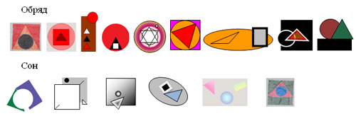 Допустим, что некая группа людей, состоящая из 4-6 человек, желает освоить эту технику. Задачей первого этапа является актуализация области семантического (смыслового) континуума у каждого участника. Дается задание изобразить смысл того или иного слова с помощью 3 геометрических фигур: круга, квадрата, треугольника, при условии, что им можно придавать любую конфигурацию, произвольно располагать относительно друг друга и закрашивать в какой угодно цвет. Такие себе правила игры, а, говоря научным языком, они выступают параметрами локальной визуальной знаковой среды. Зачем они вводятся?