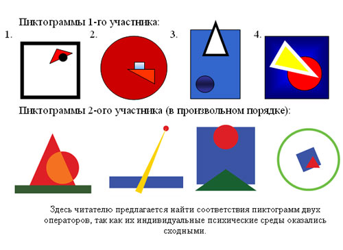Но часто пиктограммы, изображающие одно и тоже слово, сильно различаются, что затрудняет их правильное опознание друг у друга. Правда, через некоторое время совместной работы процент угадывания соответствий пиктограмм и слов значительно возрастает; если его величина превысит 85%, значит можно переходить ко второму этапу – формированию групповой локальной знаковой среды. При этом операторам дается новое задание – рисовать пиктограмму одного и того же слова за себя и за другого участника. Но о нем – в следующий раз.